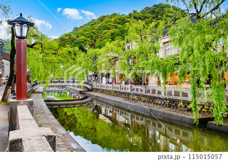 城崎温泉街を流れる川と橋と新緑の柳並木