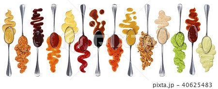 Cartoon set of sauces and dressings. Mayonnaise, barbecue, ketchup,mustard, soy sauce, tartar, curry. Various bottles and cans of sauces.