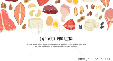 Eat your protein vector banner. Set of fish and meat, nuts and seedsn. Beef, pork, chicken meat, salmon, tuna, liver, tofu, almond, eggs, pumpkin and sunflower seeds. Sources of protein