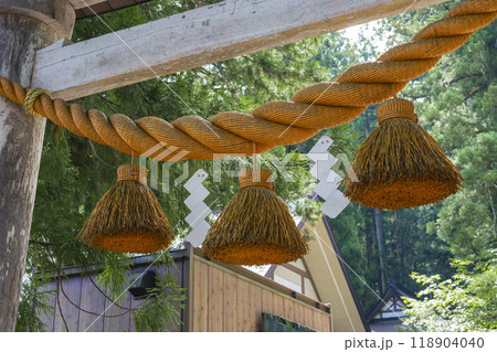 白川八幡神社 大鳥居のしめ縄と紙垂 奥に社殿が見える