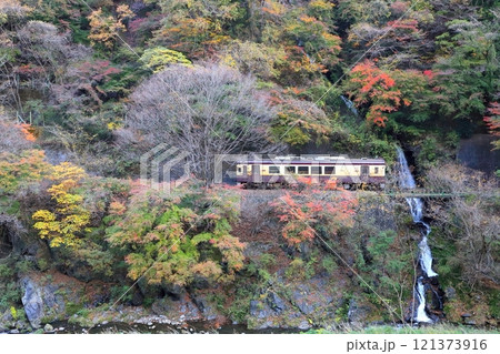 わたらせ渓谷鐵道「紅葉した山奥の滝横を走る列車」