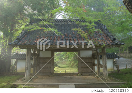 秋近づく中尊寺 朝もやに包まれる門 大長寿院参道 岩手県