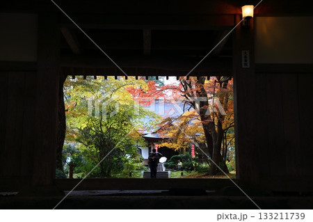 世界遺産中尊寺 光差し込む秋の朝 大長寿院門 岩手県