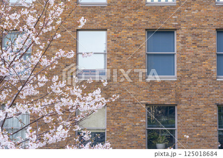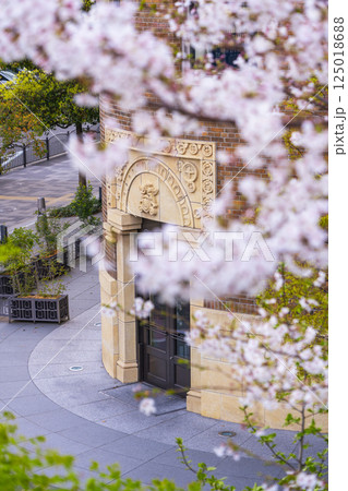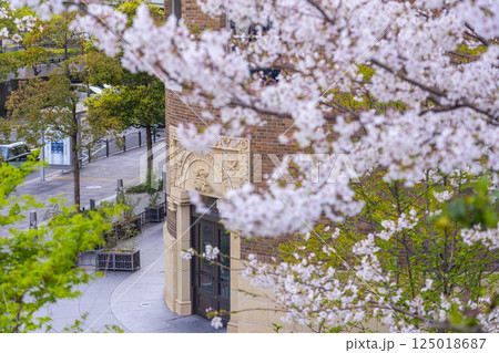 満開の桜とダイビル本館の煉瓦壁