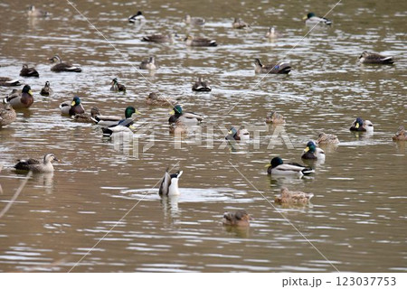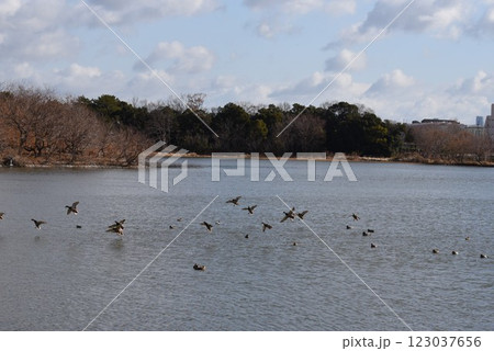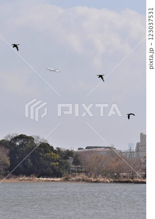 空を覆う野鳥と大阪伊丹空港を離陸した飛行機との共演 都会のオアシス伊丹昆陽池公園