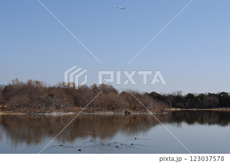 大阪伊丹空港離陸コース直下 日本列島が目印 飛行機と野鳥が舞う 都会のオアシス伊丹昆陽池公園