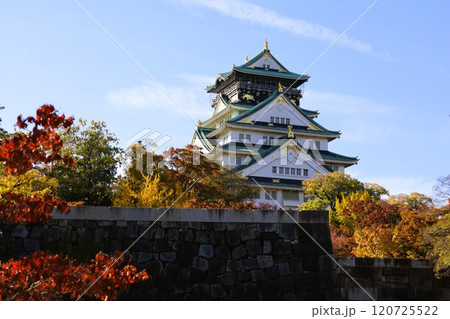 秋晴、紅葉の大阪城、天高く肥ゆる秋の空、銀杏、いちょう、なにわのことも夢のまた夢、柳や紅葉、青空の城