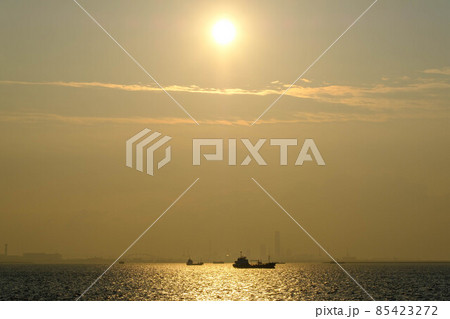 早朝、朝日にキラキラ輝き、黄金色に輝く海。兵庫県芦屋市芦屋浜より大阪湾を臨む。遠くに大阪南港のビルが