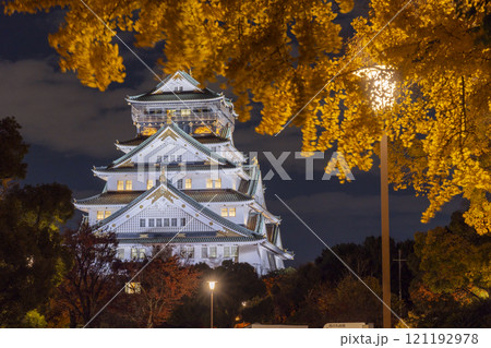 秋の大阪 黄葉したイチョウの葉と大阪城天守閣ライトアップ 本丸広場にて