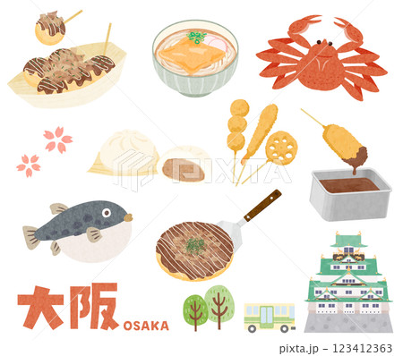 手描き風大阪グルメ 大阪城 バス イラストセット