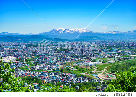 (北海道)初夏の旭川市の街並みと大雪山連峰