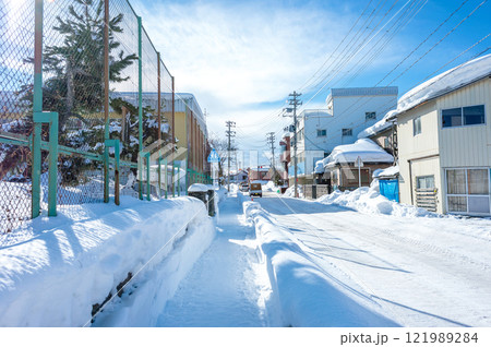 雪国の生活:豪雪の中の久しぶりの晴天、小学校の通りの歩道の様子