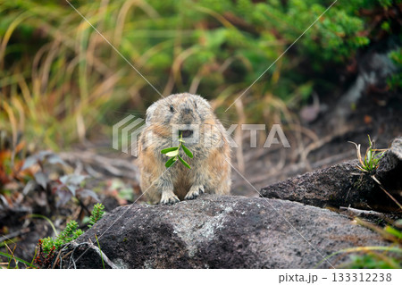 植物の緑あるガレばで瞑想するエゾナキウサギ