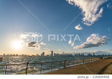冬晴れの大黒ふ頭西緑地から横浜港と横浜ベイブリッジ