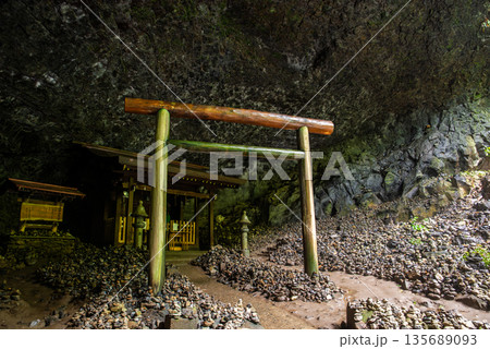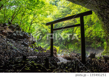 宮崎県 高千穂 天安河原 仰慕ヶ窟に広がる積み石と鳥居の風景