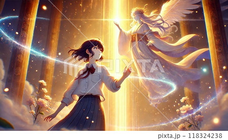 天界の存在と出会う少女の神秘的な瞬間