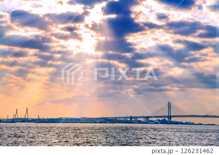 日本の横浜都市景観天使の梯子や大黒ふ頭のクイーン・エリザベス、自動車運搬船などを望む