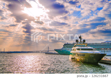 日本の横浜都市景観2隻の豪華客船。ノルウェージャン・スピリットやクイーン…、ぷかりさん橋などを望む