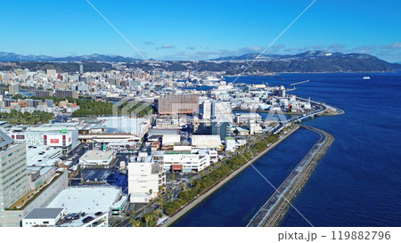 鹿児島市与次郎の海岸から積雪の街並みの空撮