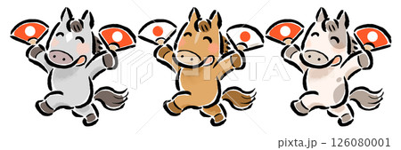 お正月に扇子を持って踊る3頭の干支の馬(午)