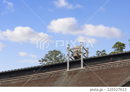 檜皮葺(ひわだぶき)屋根の上の天水桶
