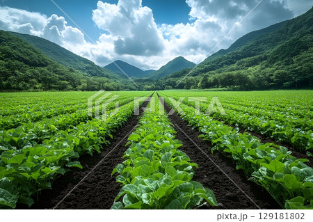 Lush Green Farm Field with Mountain View Under Blue Sky for Agricultural Poster Design Generative AI