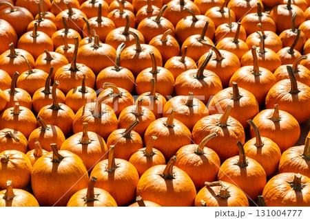 Pile of many ripe orange bright pumpkins on stone floor against straw hay at pumpkin farm yard. Halloween thanksgiving celebration symbol plant. Country rustic squash autumn background