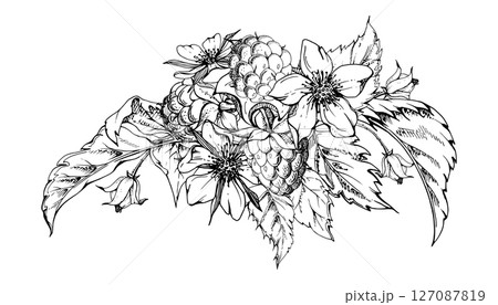 Raspberry flower buds, leaves asymmetrical bunch cluster group, hand drawn in vector ink, ripe forest garden berry. Isolated botanical illustration for dessert menu, wedding, farmers market calendar