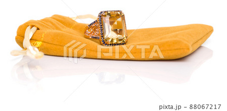 Citrine with Blue Sapphire ring on yellow velvet bag. Collection of natural gemstones accessories. Studio shot