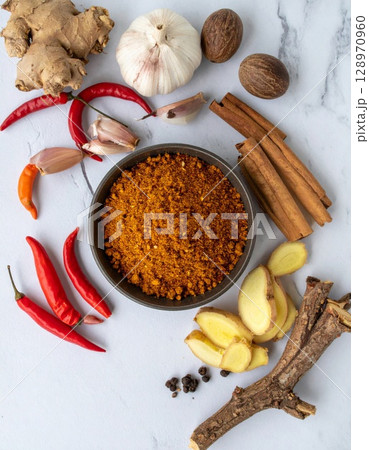 Overhead Flat Lay of Spices and Herbs on White Marble Featuring Chili and Ginger