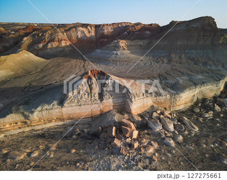Sunlit sandstone butte and colored cliffs of Aktumsuk cape Karakalpakstan desert