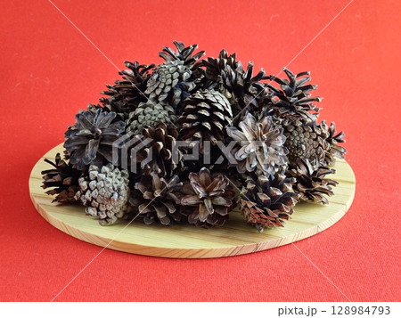 New Year's set for creativity. Natural pine cones of medium size on a wooden board