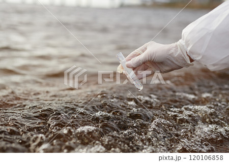 Close up of hand holding test tube and scientist doing water probe at industrial waste site, copy space