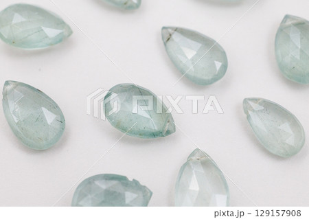 優しい水色のアクアマリンビーズ|白背景に並んだ雫型天然石の素材写真