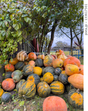 Large pile of colorful pumpkins lying under a tree in a rural garden setting. Concept: Harvest Season