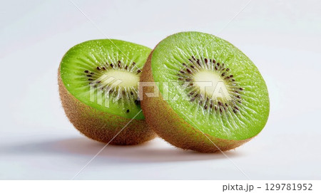 A fresh kiwi, sliced in half, reveals a vibrant green interior with a pattern of black seeds and a white center against a clean, white background