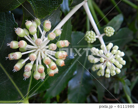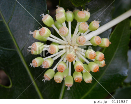 寒い時期に白い花を咲かせるヤツデ。別名、天狗のうちわ。縁起を担いで玄関先に植えられることが多い。