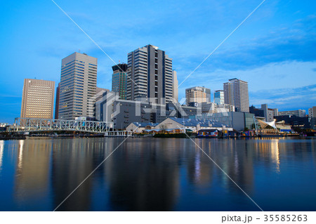 夕暮れの天王洲アイルの高層ビル群とふれあい橋