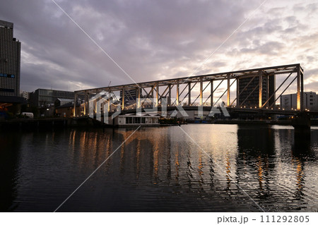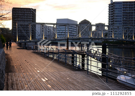 夕暮れの天王洲ふれあい橋と天王洲アイル方面の高層ビル群