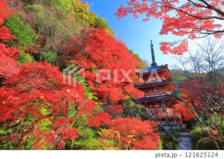 【京都府】快晴の三室戸寺の三重塔と紅葉