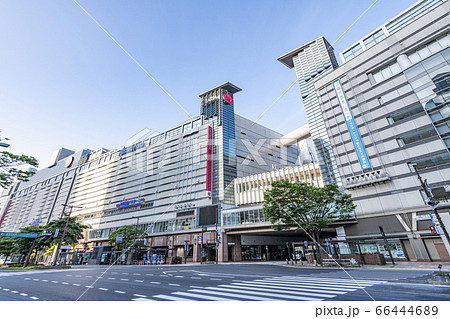 福岡市中央区天神の渡辺通り天神バスセンター前交差点から福岡三越側 西鉄福岡駅 朝カラー