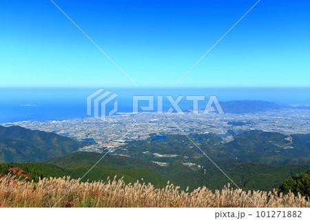 【香川県】晴天の雲辺寺山頂公園から見た観音寺市街地と町並み