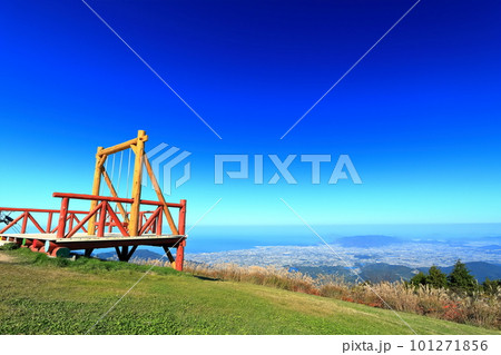 福岡県苅田町の里山等覚寺にあるブランコと市街地遠望
