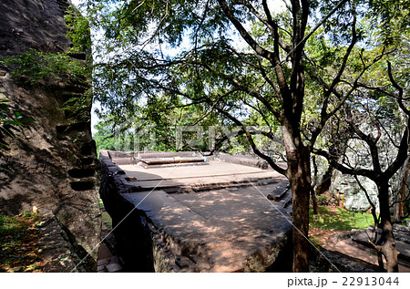 シーギリヤ・ロックの中腹の回廊、左の巨石の上は会議堂