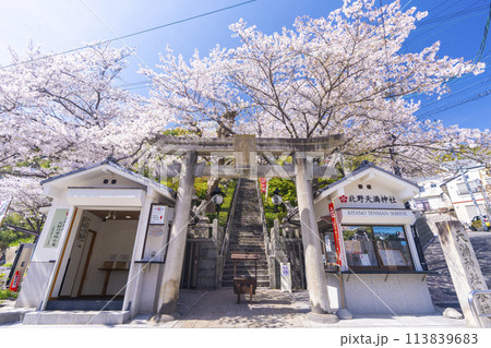 春の神戸 北野天満神社 石鳥居と満開の桜