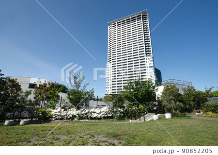 オーパス夢広場からプリズムタワーを見上げる 池尻大橋駅前 夏晴れの青空 東京都目黒区