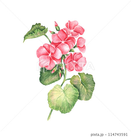 Pink flower of garden plant geranium.Blooming Floral hand drawn watercolor illustration with rad flowers and leaves on a white background. Pelargonium