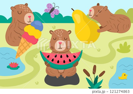 Vector capybara landscape illustration. Cute scenery with capibaras holding fruits and ice-cream. Funny scene with adorable animals. Happy land picture for kids with pear, watermelon, butterfly