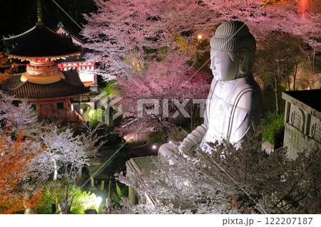 【奈良県】桜が満開の壺阪寺の夜景(桜大仏)