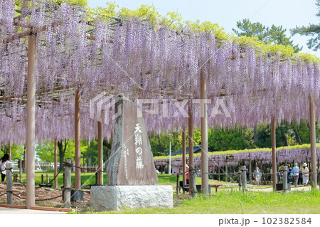 色鮮やかな藤棚の花が咲き誇る風景(天翔の藤 天王川公園の藤 愛知県 津島市)